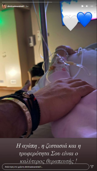 Τα ξημερώματα της Δευτέρας (1/10 ) η Δήμητρα Αλεξανδράκη έκανε ένα νέο story. Ανέβασε μία φωτογραφία από το νοσοκομείο, στην οποία ο άντρας της τής κρατά το χέρι, και τη συνόδευσε με τα εξής τρυφερά λόγια: «Η αγάπη, η ζεστασιά και η τρυφερότητα σου είναι ο καλύτερος θεραπευτής».
